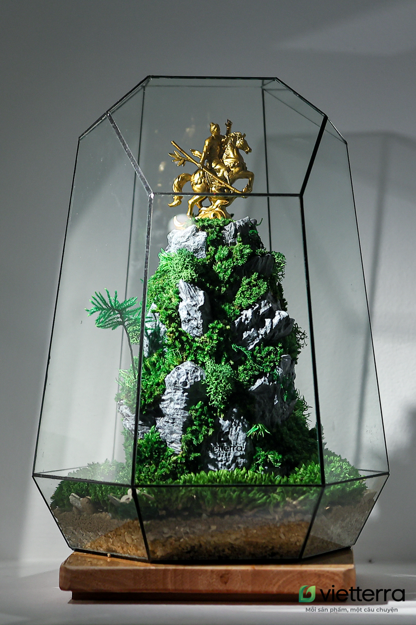 Tác phẩm "Huyền thoại Vươn vai" tái hiện khoảnh khắc bi tráng và hào hùng nhất của Thánh Gióng - biểu tượng bất diệt cho sức mạnh quật khởi và khát vọng hòa bình của dân tộc Việt. Kết hợp giữa công nghệ tạo hình 3D tiên tiến và nghệ thuật sắp đặt rêu bảo tồn thủ công, tác phẩm không chỉ là một vật phẩm trưng bày, mà là một di sản văn hóa được thu nhỏ, mang năng lượng mạnh mẽ của sự bứt phá và vươn tầm.